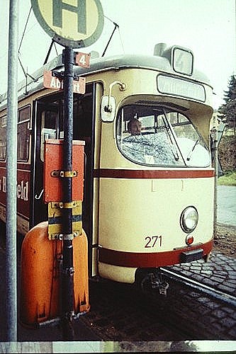 ![]() Endstation Fähre Holtenau TW 271 - DUEWAG (Bj. 1961) sechsachsiger Gelenktriebwagen (Einheitswagen - GT6) Länge: 19,1 m - Breite: 2,2 m - Gewicht: 20,5 t - Sitzplätze: 45 - Stehplätze: 115 Gesamtbestand bei der KVG: 15 St. |