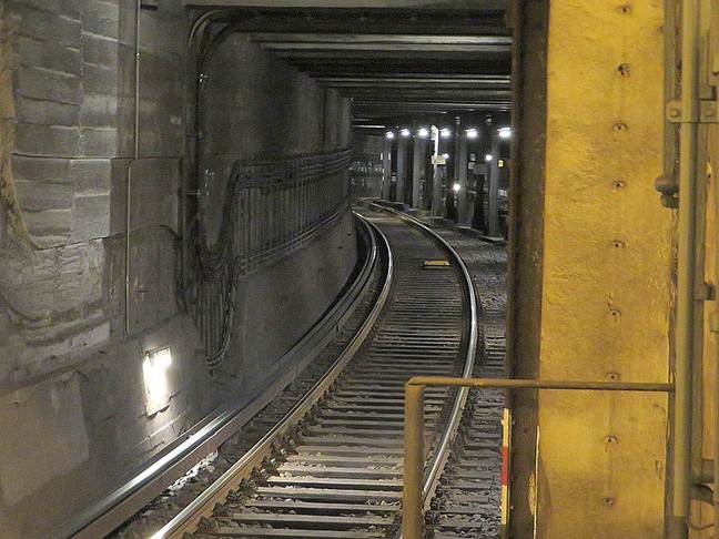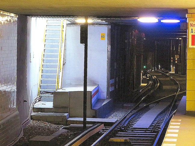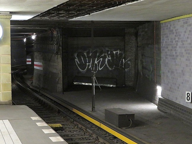 ![]() Fahrtrichtung Kurfürstenstraße und in die Abstellanlage unter der Genthiner Straße (die bis fast an die Lützowstraße geht), dieses Tunnelstück war für die geplante Linie zum Tiergarten Mitte der zwanziger Jahre gebaut worden und wurde 1970/71 zu einer Abstellanlage verlängert ![]() |
