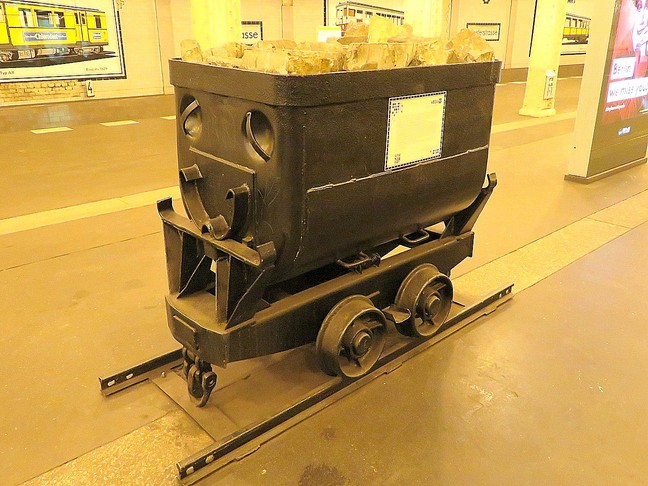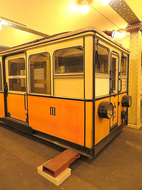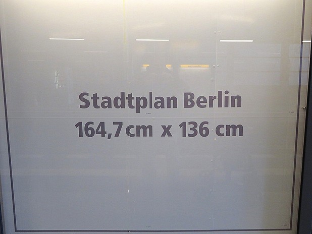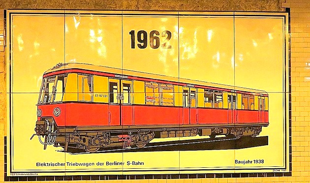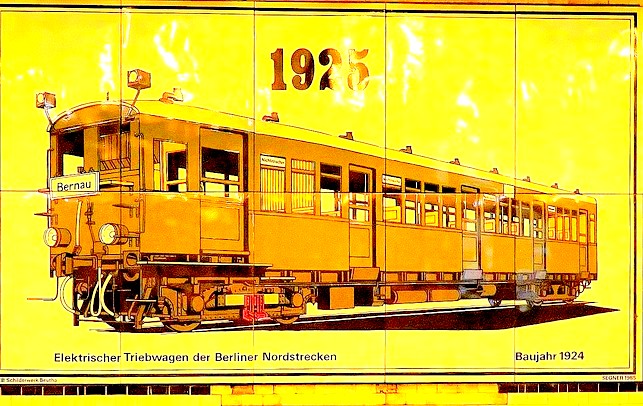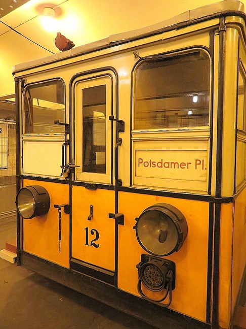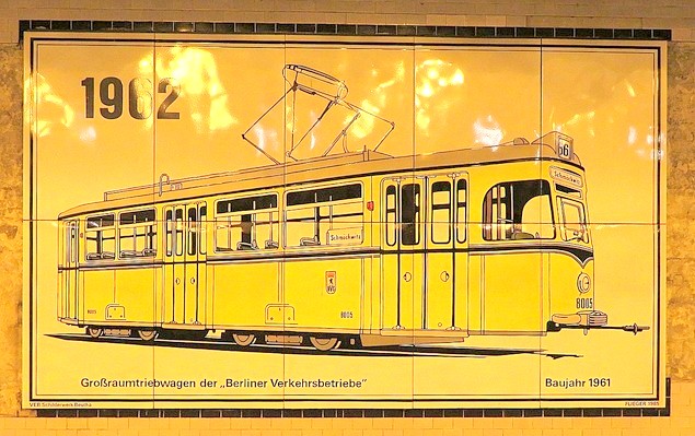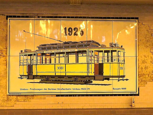 ![]() Der Wagen 12 steht auf dem in der Klosterstraße geplanten Gleis der Linie zur Frankfurter Allee, das im Boden erkennbare hellere Band stellt die geplante Bahnsteigkante dar. Gebaut wurde aber die Großprofilstrecke vom Alexanderplatz (heutige U 5) |