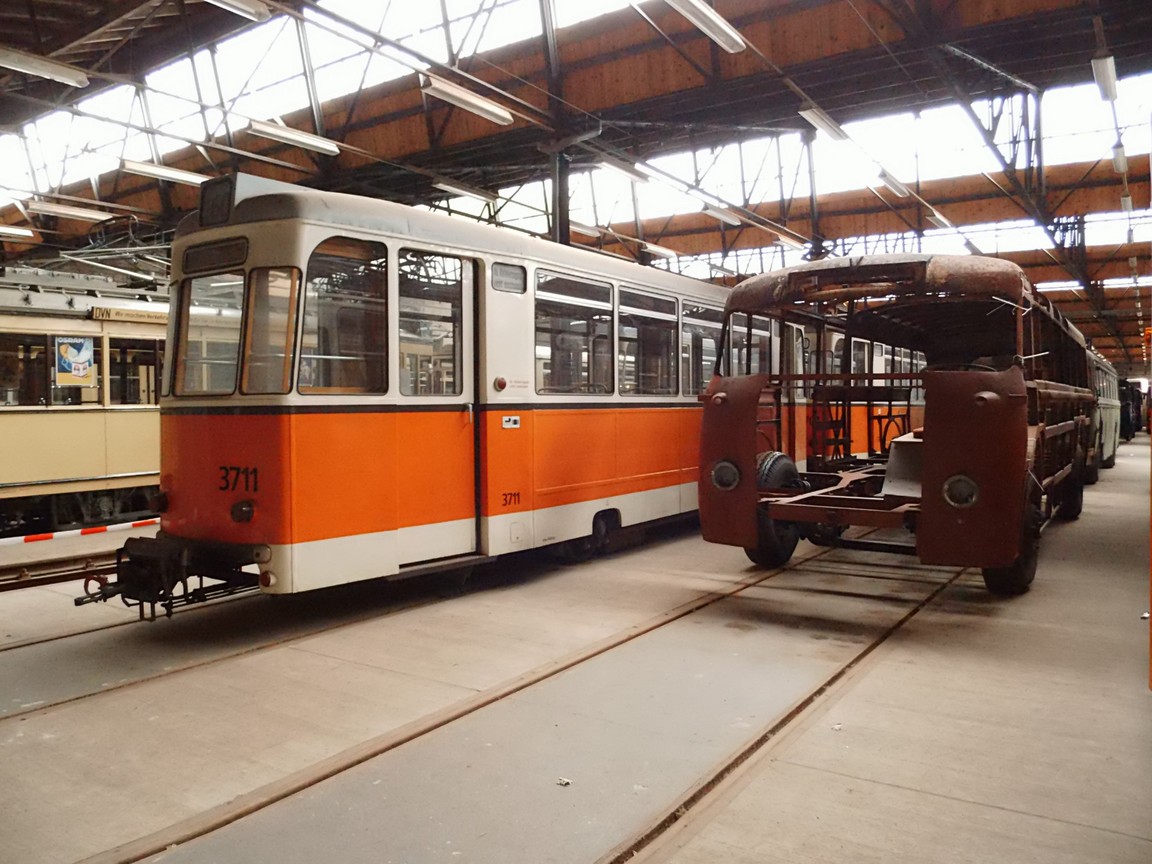 ![]() Beiwagen 3711 des Zweirichtungs-Rekozuges TZ/BZ daneben das "Gerippe" eines "Stadtbus" Typ H6B/S |