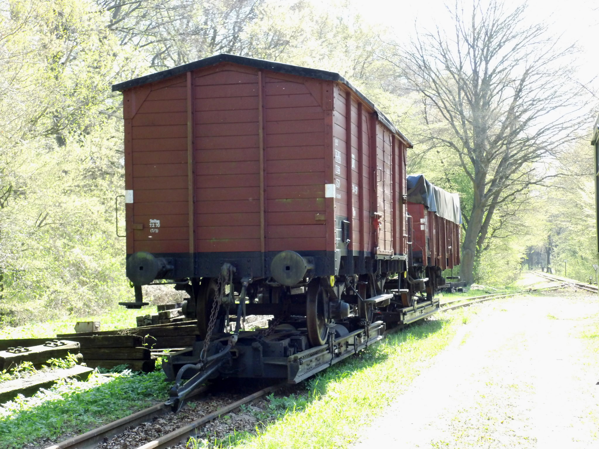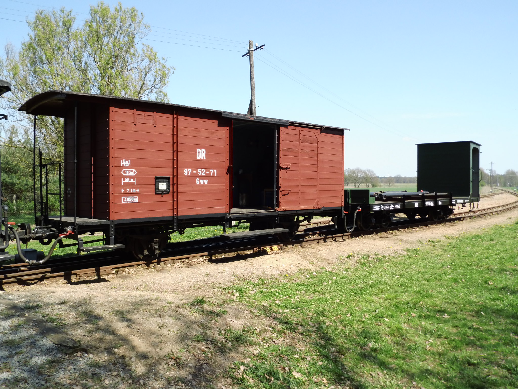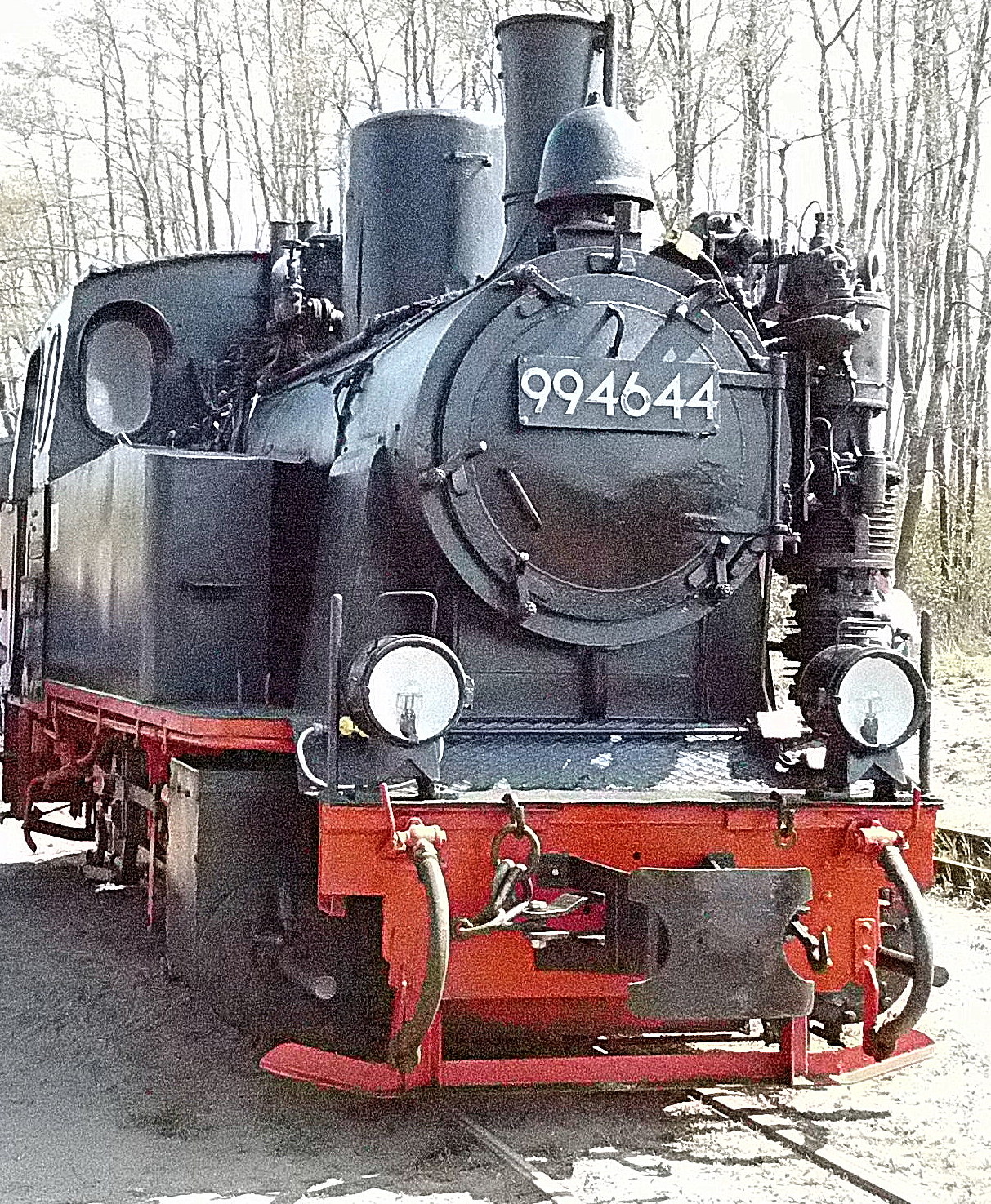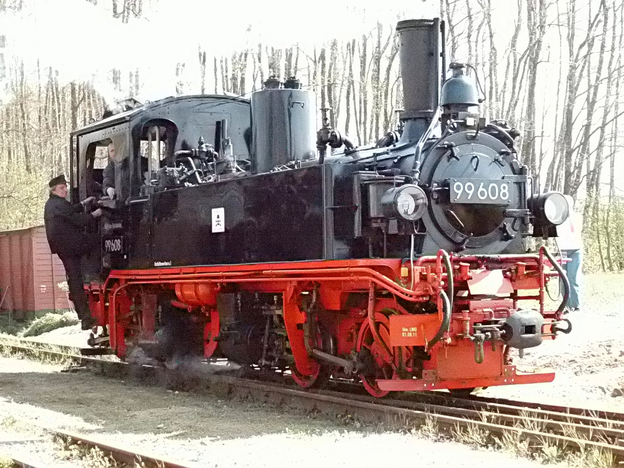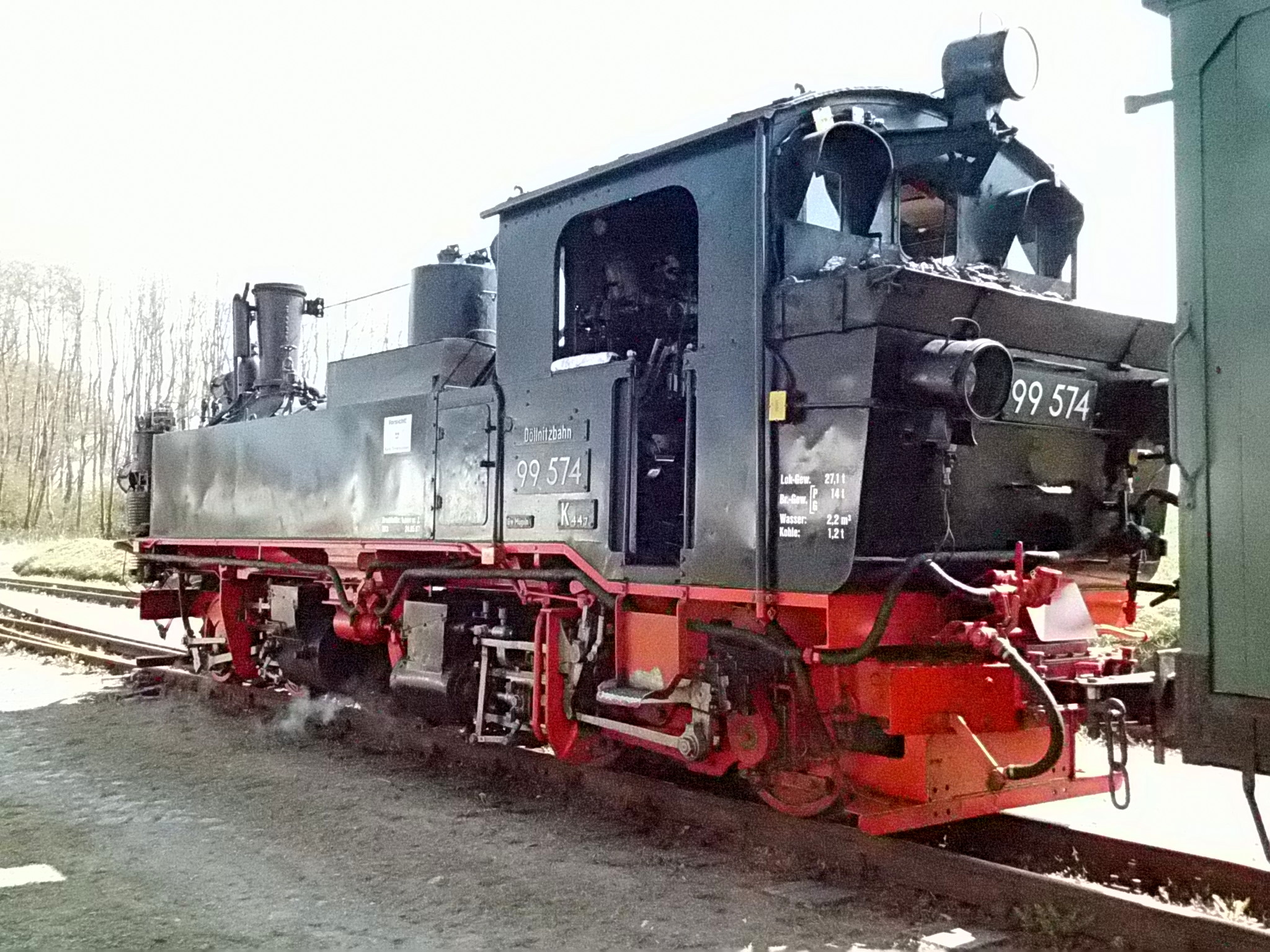 99 574 vom "Wilden Robert" zu Besuch aus dem sächsischen Mügeln, nicht die erste große Reise dieser Lok, schon vom 22.11.55 bis 23.1.56 war sie bei der Kleinbahn des Landkreises Jerichow I zu Gast. Hersteller: Hartmann - Baujahr: 1912 - Fabriknummer: 3556 - Sächsische Betriebsnummer: 164 - Rekonstruktion/Neubau: 1964 RAW Görlitz - Reichsbahn-Nummer bis 1970: 99 574 - Besonderheit: Druckluftbremse Im Bahnhof Lindenberg 99 4511 - Bauart: Cn2t - Die letzte "heimliche" Neubaudampflok für die Deutsche Reichsbahn (DDR) wurde 1966 auf Rügen in Betrieb genommen. Am 4. Januar 1967 wurde die Lokomotive dem Bw Wittenberge zugeteilt. Von diesem Zeitpunkt an gehörte die Lokomotive zur Prignitzer Schmalspurbahn. Am 6. März 1973 wurde die Lok ausgemustert. 1998 kaufte die IG Preßnitztalbahn e.V. die 99 4511 und baute die Lok neu auf. Sie ging am 18. Mai 2002 wieder in Betrieb. V 10 101 V 10 103 In Mesendorf 99 608 (Gattung IV K) der Sächsischen Dampfeisenbahngesellschaft (SDG) in Mesendorf ![]() 99 4644 (Vor-)Wärmeschutzwagen 97-52-73 Baureihe EL 9 aus Hennigsdorf bei Berlin Diese Kleinloks stammen aus dem Lokomotivbau Elektrotechnische Werke Hans Beimler Hennigsdorf und passen in der Größe eher zu einer Gruben- oder Feldbahn als zu einer schmalspurigen Kleinbahn. Ehemaliges Einsatzgebiet rund um Mansfeld (heute Mansfelder Bergwerksbahn). 99 608 mit ihrem Zug nach Lindenberg bereit zur Abfahrt in Mesendorf. V 10 102 99 574 ist aus LIndenberg kommend in Mesendorf eingetroffen. Wagen 97-55-16 Wagen 97-52-71 Die Lok hat umgesetzt und wird den Zug gleich an den Bahnsteig in Lindenberg zurück drücken. |