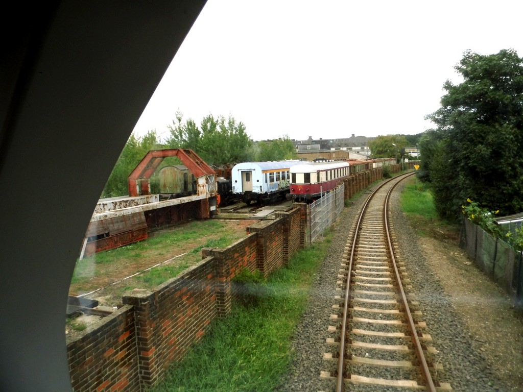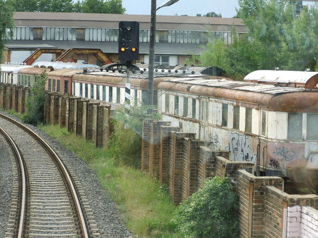 Das Gelände der ehemaligen Waggonfabrik mit abgestellten Trieb- und Beiwagen